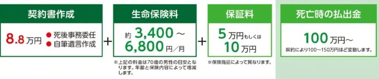 • 2 「既払込保険料」+「保証料5万円もしくは10万円」+「保証金最大35万円」が、死後事務にかかる費用の原資となります。