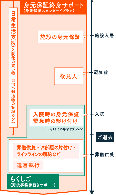 • らくしごパック(入院時・緊急時の身元保証サービス)をご利用される場合、利用要件と事前審査があります。事前審査は身元保証相談士協会の規定による形となります。介護施設などで、常時の身元保証を希望される方は「身元保証スタンダードプラン」をご案内させていただきます。