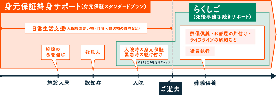 • 追加契約によって、サ高住や一般賃貸住宅、入院時の「連帯保証人」の引受けが可能です。この場合には、らくしごパックのお申込みが必須となります。