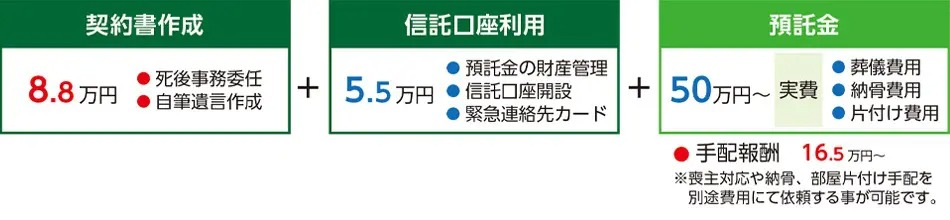 • 死後事務の内容と範囲によって死後事務報酬が変動いたします。個別説明にてご確認ください。